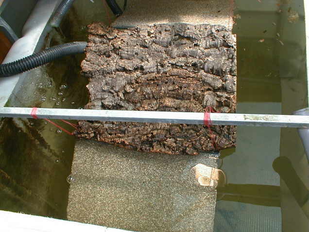 Quarantänetank mit Glasinsel, 2 Schrägen mit Kies, Mittelteil mit Kork ausgelegt. Die Schildkröten sollten trocken sitzen können.
