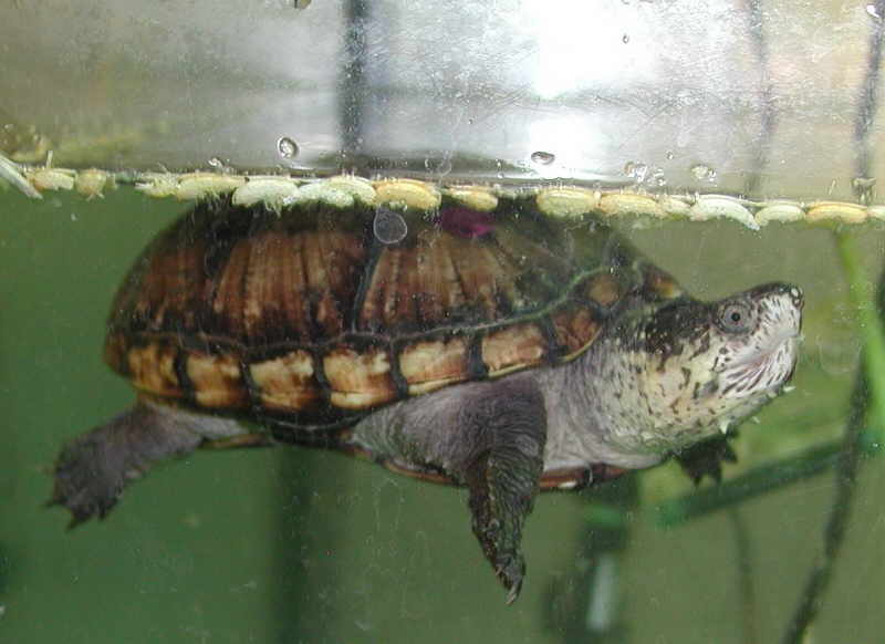scheu. Unterwasserhöhle und Wurzel als Kletterhilfe zur Wasseroberfläche
